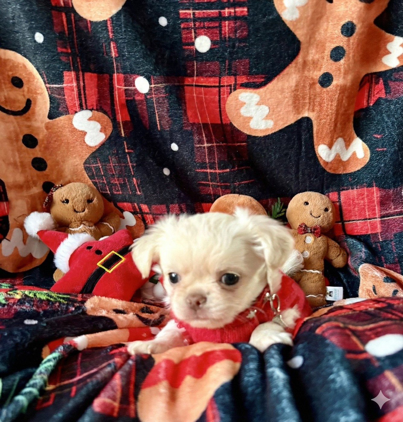 Ravissant mâle Chihuahua au pelage clair rappelant celui d un petit ourson polaire. Avec sa frimousse ronde, ses yeux tendres et son allure câline, il incarne la douceur absolue.